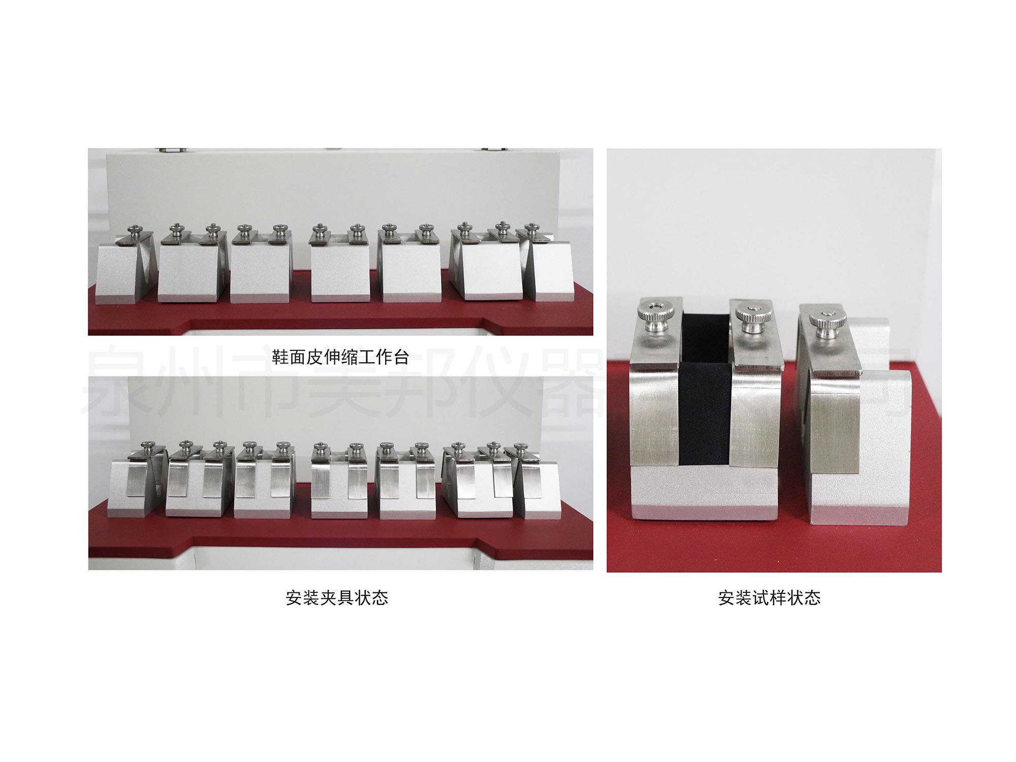 用于以往復(fù)伸縮快動(dòng)作,模擬鞋子穿著后,行走過(guò)程中鞋面受到的拉伸、擠壓、曲折的伸縮,造成鞋子材料產(chǎn)生褶痕,皺紋或受損情形,作為選用鞋面材料參考依據(jù)。