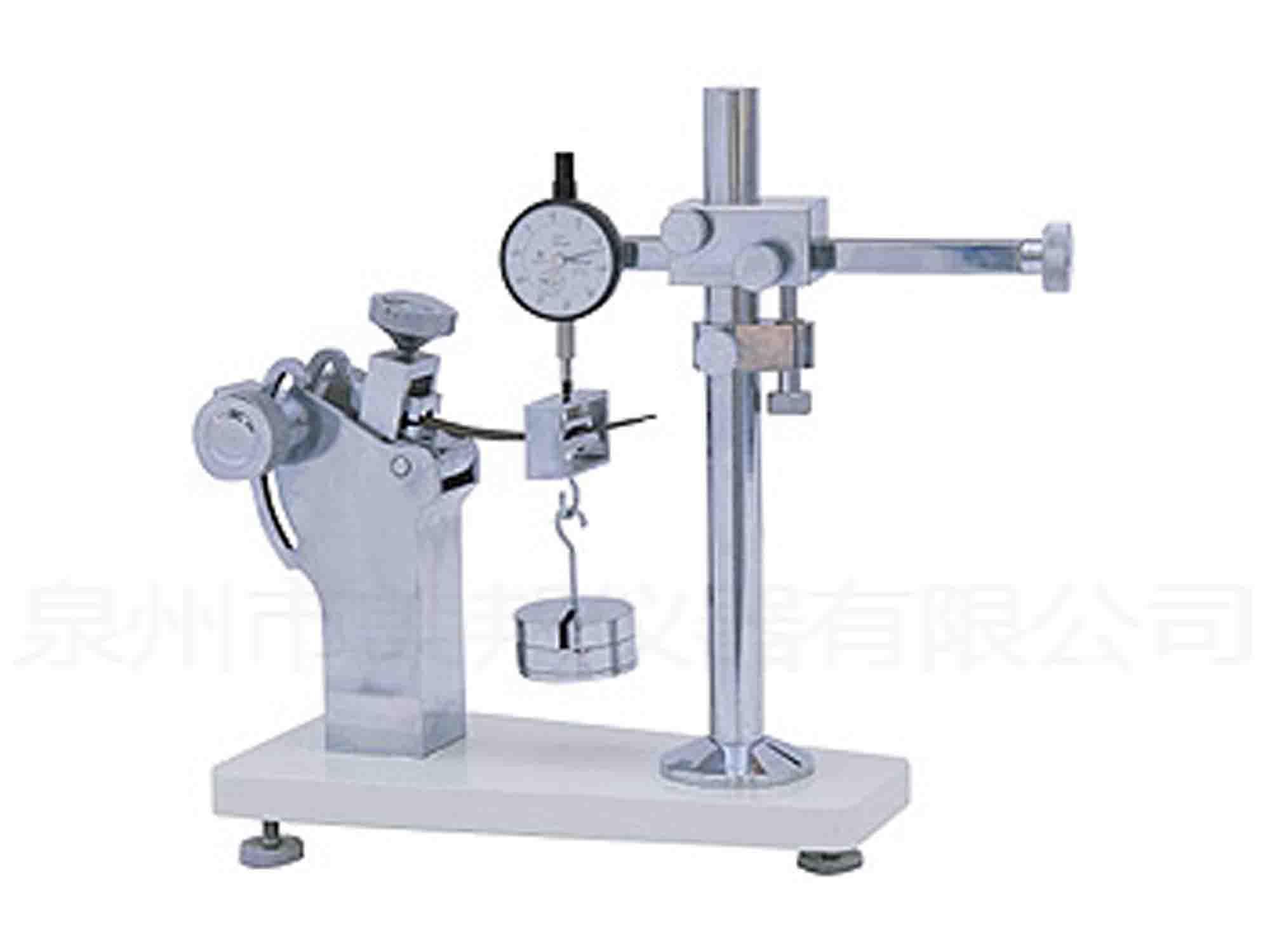 This machine is used to test the longitudinal bending strength of leather shoes. In the test, the rear end of the shoe is fixed, the front end is hung on the weight and the test piece is deformed, and the bending deflection of the hook is taken as the basis for calculating the bending strength.